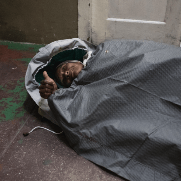 Shelterbag is a sleeping bag used for people who are currently starting on the street. It’s water proof and provides a warm sleeping bag but also a way to move bag that contain compartments for a person to place all their belongings during the day.